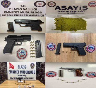 Elazig Cumhuriyet Bassavciligi Koordinesinde Il Emniyet Müdürlügü Asayis Sube Müdürlügü tarafindan genel güvenlik ve genel asayisin saglanmasi, suça konu unsurlarin tespiti ve süpheli sahislarin yakalanmasina yönelik yapilan çalismalarda, 6 süpheli sahsin üstünde ve araçlarinda arama yapildi. Aramada, 5 adet ruhsatsiz tabanca ve tabancalara ait 54 adet fisek, 36 gram esrar maddesi, 47 adet sentetik ecza maddesi ve 2 gram kokain maddesi ele geçirildi.