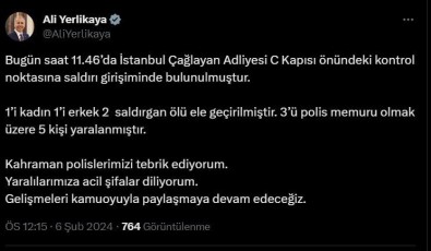 Bakan Yerlikaya’nin sosyal medya hesabindan yaptigi açiklamada, “Bugün saat 11.46’da Istanbul Çaglayan Adliyesi C Kapisi önündeki kontrol noktasina saldiri girisiminde bulunulmustur. 1’i kadin 1’i erkek 2 saldirgan ölü ele geçirilmistir. 3’ü polis memuru olmak üzere 5 kisi yaralanmistir. Kahraman polislerimizi tebrik ediyorum. Yaralilarimiza acil sifalar diliyorum. Gelismeleri kamuoyuyla paylasmaya devam edecegiz” ifadeleri yer aldi.