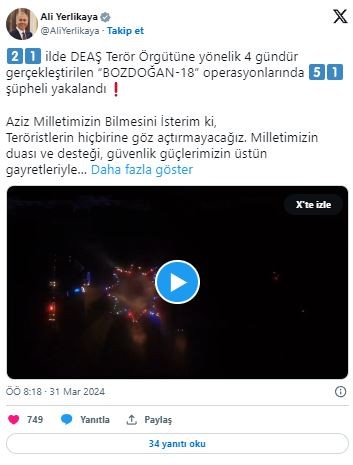 İçişleri Bakanı Ali Yerlikaya 21 ilde DEAŞ Terör Örgütüne yönelik 4 gündür gerçekleştirilen "BOZDOĞAN-18" operasyonlarında 51 şüphelinin yakalandığını açıkladı.