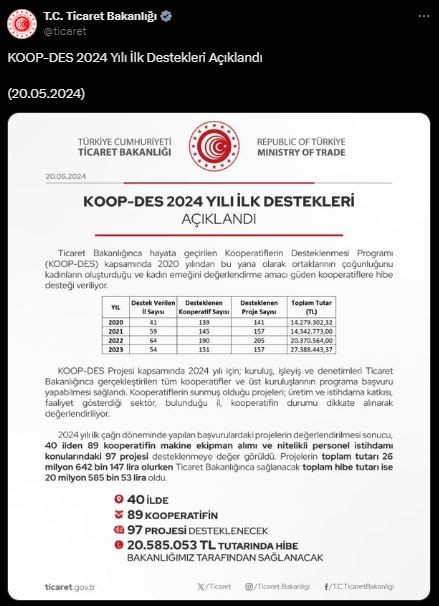 Ticaret Bakanlığınca hayata geçirilen Kooperatiflerin Desteklenmesi Programı (KOOP-DES) kapsamında 2020 yılından bu yana ortaklarının çoğunluğunu kadınların oluşturduğu ve kadın emeğini değerlendirme amacı güden kooperatiflere hibe desteği veriliyor.