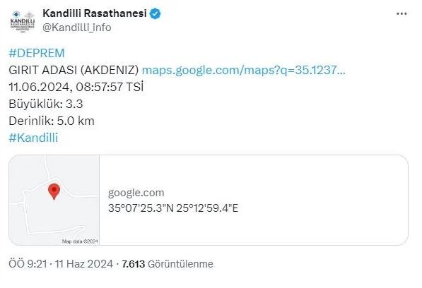 Kandilli Rasathanesi'nin sosyal medya adresinden yapılan açıklamaya göre, Akdeniz'de Girit Adası'nda saat 08.57 sıralarında 3.3 büyüklüğünde bir deprem meydana geldi.Depremin 5 kilometre derinlikte gerçekleştiği bildirildi.