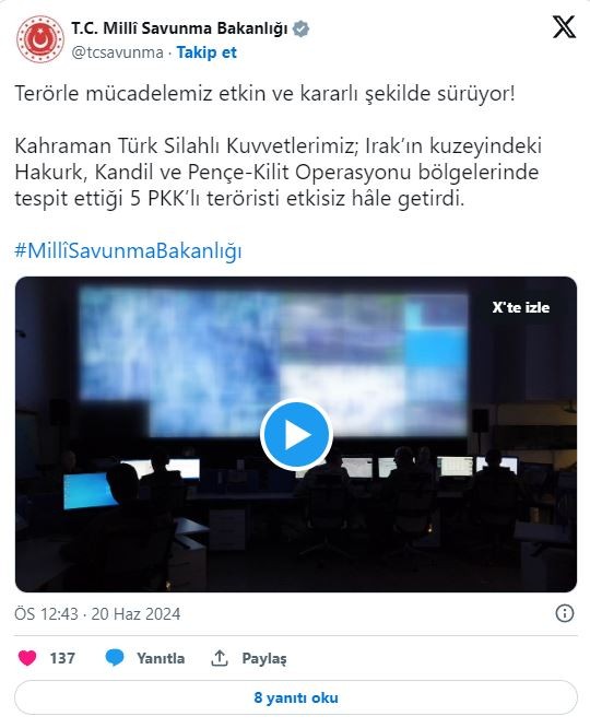 Milli Savunma Bakanlığı'ndan terörle mücadeleye ilişkin yeni bir açıklama geldi. Bakanlıktan yapılan açıklama şöyle:Terörle mücadelemiz etkin ve kararlı şekilde sürüyor. Kahraman Türk Silahlı Kuvvetlerimiz; Irak'ın kuzeyindeki Hakurk, Kandil ve Pençe-Kilit Operasyonu bölgelerinde tespit ettiği 5 PKK'lı teröristi etkisiz hâle getirdi.