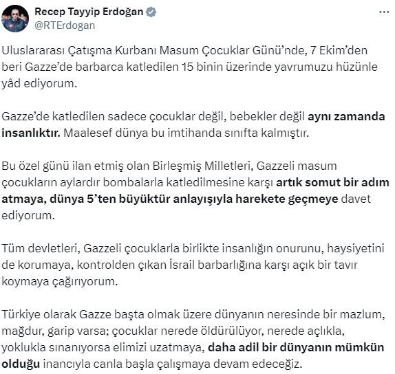 Başkan Recep Tayyip Erdoğan, "Uluslararası Çatışma Kurbanı Masum Çocuklar Günü’nde, 7 Ekim’den beri Gazze’de barbarca katledilen 15 binin üzerinde yavrumuzu hüzünle yâd ediyorum." açıklamasında bulundu. Başkan Erdoğan, "Gazze’de katledilen sadece çocuklar değil, bebekler değil aynı zamanda insanlıktır. Maalesef dünya bu imtihanda sınıfta kalmıştır." ifadelerini kullandı.