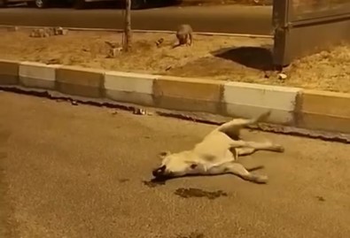 Mardin’in Nusaybin ilçesinde basibos sokak köpekleri, yol ortasinda baska bir köpege saldirdi. Saldiriya ugrayan köpek telef oldu.