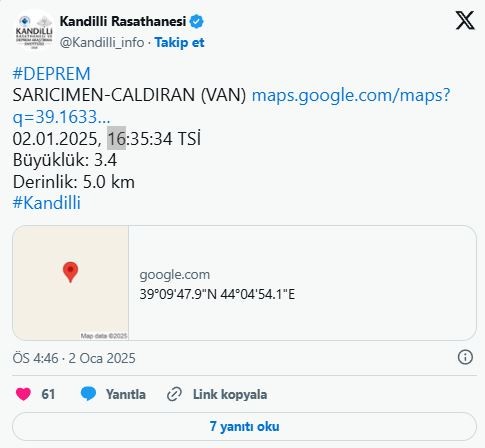 Van'da 3.4 büyüklüğünde deprem gerçekleşti (02.01.2025-16:35)