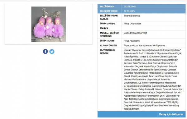 Ürünün 'Oyuncak Güvenliği-Mekanik Ve Fiziksel Özellikler' Testlerinden Ts En 71-1 Madde 5.1B'ye Aykırı Olarak Küçük Parça İçermesi, Madde 5.10'A Aykırı Olarak Küçük Top İçermesi, Madde 5.13'E Aykırı Olarak Peluş Anahtarlığın Zincirine Takılı Vantuzun Tork Testinde Kopması Ve E Kalıbından Geçerek Küçük Parça Oluştuması. Bununla Birlikte Ürünün Etiketlemesi İle İlgili Kısımda; Oyuncak Güvenliği Yönetmeliğinin 7.Maddesinin 3.Fıkrasına Aykırı Olarak İthalatçının Kayıtlı Ticari İsmi Veya Kayıtlı Ticari Markası Ve Kendilerine Ulaşılabilecek Adresinin Bulunmaması, Ce İşareti Yönetmeliğinin 9.Maddesinni 2.Fıkrasına Aykırı Olarak Ce İşaretinin Boyutunun 5Mm'den Küçük Olması. Peluş Anahtarlık Ürünün Oyuncak Bebek Yüz Parçasında Kimyasalların Kaydı, Değerlendirilmesi, İzni Ve Kısıtlanması Hakkında Yönetmelik'in Ek-17 Listesinde Yer Alan 1000 Mg/Kg Üst Limit Değerini Geçmemesi İstenen Oyuncak Ürünlerinde Kısıtlı Kimyasallardan 7200 Mg/Kg Dınp Ve 99.050 Mg/Kg Dehp Fitalat Bileşikleri İhtiva Ettiği Tespit Edilmiştir.