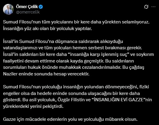 AK Parti Sözcüsü Ömer Çelik, İsrail'in Küresel Sumud Filosu'na saldırısıyla ilgili sosyal medya hesabı üzerinden açıklamada bulundu. Hain saldırıya tepki gösteren Ömer Çelik, "İsrail’in Sumud Filosu’na düşmanca saldırarak alıkoyduğu vatandaşlarımızı ve tüm yolcuları hemen serbest bırakması gerekir. İsrail’in saldırıları bir kere daha “insanlığa karşı işlenmiş suç” ve soykırım faaliyetini devam ettirme olarak kayda geçmiştir. Bu saldırıların sorumluları hukuk önünde muhakkak cezalandırılmalıdır. Bu çağdaş Naziler eninde sonunda hesap verecektir. " ifadelerini kullandı.