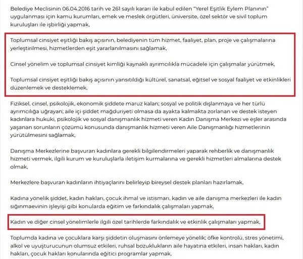 Belediye, 'Kadın ve diğer cinsiyet yönelimlerle ilgili özel tarihlerde farkındalık çalışmaları yapmak' taahhüdüyle de, kamu kaynaklarını toplumun geneli tarafından 'sapkınlık' olarak görülen eğilimlerin meşrulaştırılması ve kutlanması için seferber ediyor. Bu durum, CHP zihniyetinin, Türk aile yapısını bozmak ve milli-manevi değerleri aşındırmak için belediyeleri birer araç olarak kullandığının açık bir şekilde gösteriyor.
