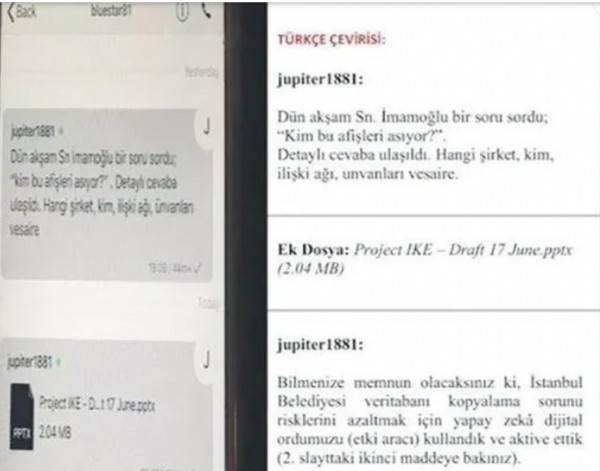 İngiliz istihbaratıyla bağlantılı Hüseyin Gün'ün, İmamoğlu'nun seçim kampanyasını yöneten Necati Özkan'a yolladığı en dikkat çeken mesajlardan biri 'Dün akşam Sn. İmamoğlu bir soru sordu; 'Kim bu afişleri asıyor?' Detaylı cevaba ulaşıldı. Hangi şirket, kim, ilişki ağı, unvanları vesaire. Bilgiler şifreli dosya içerisinde' oldu.