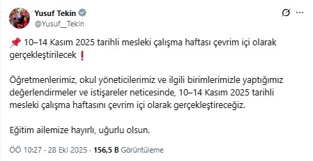 Bakan Tekin, “Öğretmenlerimiz, okul yöneticilerimiz ve ilgili birimlerimizle yaptığımız değerlendirmeler ve istişareler neticesinde, 10–14 Kasım 2025 tarihli mesleki çalışma haftasını çevrim içi olarak gerçekleştireceğiz. Eğitim ailemize hayırlı, uğurlu olsun” ifadelerini kullandı.