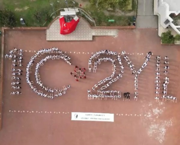 Cumhuriyet Bayramı etkinlikleri kapsamında okul bahçesinde düzenlenen programda, kırmızı-beyaz renklerle donatılmış bir koreografi oluşturarak '102. Yıl' yazısı ve Türk bayrağı figürüyle Cumhuriyet'in gururu gökyüzüne taşındı.