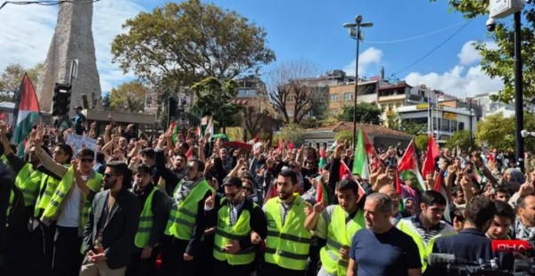 Ellerinde Filistin bayraklarıyla İsrail aleyhine sloganlar atan kalabalık, 'Bir adım ötede insanlık ölüyor, kahrolsun İsrail', 'Müslümanlar birleşin' yazılı pankartlar taşıyor.