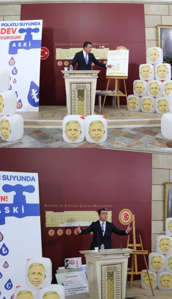 “Mansur Yavaş, 6.5 yılda bir damla yeni su kaynağı üretmedi. Ankaralılar bugün çamaşırını yıkayamıyor, bu bidonlara mahkûm. Çünkü paralar konserlere, tabutlara ve karton bardaklara harcandı.”