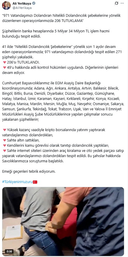 İçişleri Bakanı Ali Yerlikaya, 41 ilde nitelikli dolandırıcılık şebekelerine yönelik operasyon düzenlendiğini duyurdu. Yapılan operasyonlar sonucunda 271 şüpheli yakalanırken, banka hesaplarında 5 milyar 34 milyon TL işlem hacmi tespit edildi.