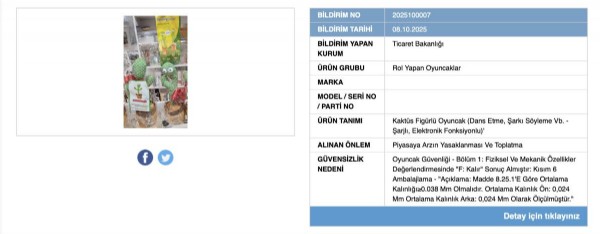 Bakanlık, “Oyuncak Güvenliği Yönetmeliği” kapsamında yapılan testlerde ürünün güvenlik standartlarını karşılamadığını belirledi