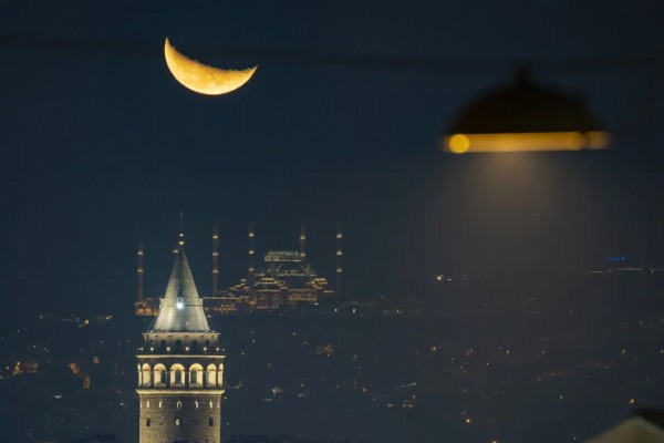 İstanbul'da akşam saatlerinde gökyüzünde beliren hilal, Galata Kulesi ile aynı karede görüntülendi.Tarihi yapının silüetiyle bütünleşen ay manzarası, kartpostallık bir görüntü oluşturdu.