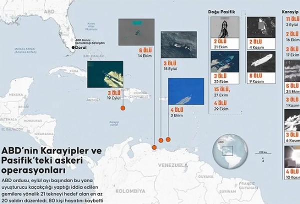 ABD, yönetimin uyuşturucu kaçakçılığı yaptığını söylediği teknelere yönelik bilinen 21 saldırı düzenledi; en az 83 kişi öldü. Trump, bu saldırıları haklı çıkaracak yeterli istihbarat olduğunu söyledi ancak yetkililer, teknelerin taşıdığı kargo hakkında detaylı kanıt sunmadı.