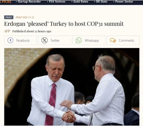 Pakistan merkezli Business Recorder, Başkan Erdoğan'ın Türkiye–Avustralya anlaşmasını memnuniyetle karşıladığını ve COP31'in Antalya'da gerçekleştirileceğini bildirdi. Haberde, 'Alışılmadık yetki paylaşımı' modelinin uluslararası iklim görüşmelerinde nadir görüldüğüne dikkat çekildi.