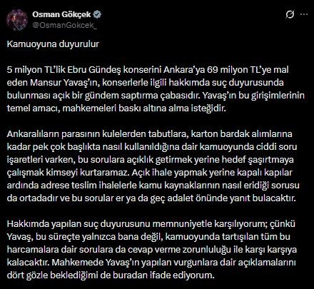 Gökçek, 5 milyon TL'lik Ebru Gündeş konserinin Ankara'ya 69 milyon TL'ye mal olduğu iddiasını hatırlatarak, Yavaş'ın suç duyurusunu “gündem saptırma girişimi” olarak nitelendirdi. Bu süreçte amacın mahkemeleri baskı altında bırakmak olduğunu söyledi.