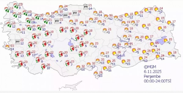 Hava durumu ile ilgili son dakika açıklaması 6 Kasım 2025 Perşembe günü Meteoroloji Genel Müdürlüğü tarafından yapıldı. Yayımlanan hava durumu tahmin raporuna göre; sıcaklıkların yurt genelinde mevsim normallerinin 3-5 derece üzerinde seyretmesi bekleniyor. Fakat Meteoroloji; İstanbul, Ankara, Bursa, Muğla ve Antalya gibi pek çok il için sağanak yağış uyarısında bulundu. Peki, bugün hava nasıl olacak? İşte 6 Kasım 2025 hava durumu tahmin raporu…
