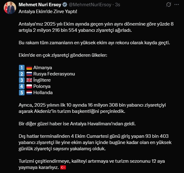 Kültür ve Turizm Bakanı Mehmet Nuri Ersoy, sosyal hesabından yaptığı paylaşımla duyurdu!
