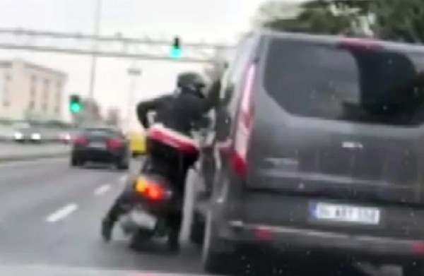 Avcılar'da trafikte yol verme nedeniyle motosiklet ile hafif ticari araç sürücüsü arasında kavga çıktı. Kavgada iki sürücü de birbirine yumrukla saldırdı.
