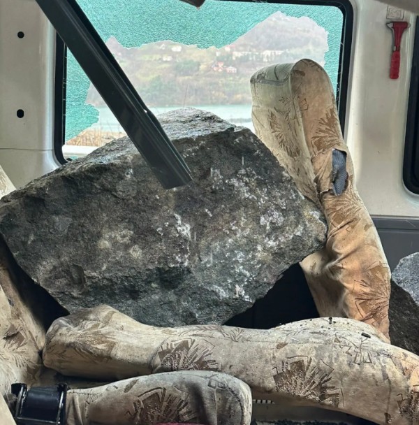 Kaya, minibüsün tavanını parçalayarak araç içerisine girerken koltuğun üzerine düştü.