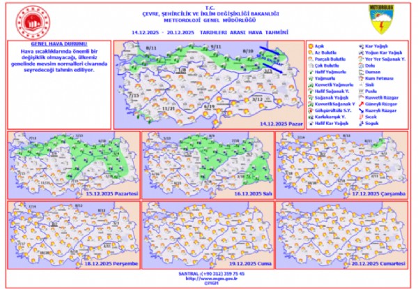 Hava sıcaklıkları yeni haftada Ankara'da 12-14, Ankara'da 7-8, İzmir'de 15-17, Antalya'da 20-23, Samsun'da 10-12 derece civarında seyredecek.