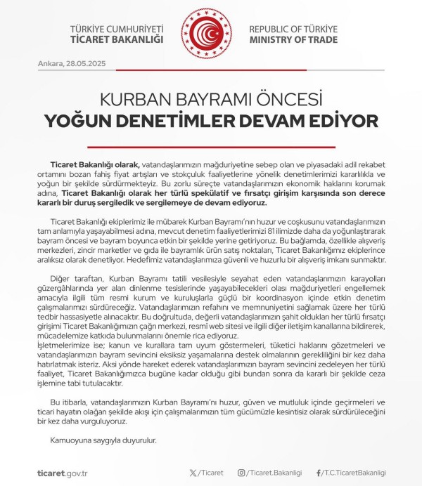 Bakanlıktan yapılan açıklamada, “Her türlü spekülatif ve fırsatçı girişime karşı son derece kararlı bir duruş sergilemeye devam ediyoruz” denilerek, bayram boyunca tüketicilerin ekonomik haklarının korunacağı vurgulandı.