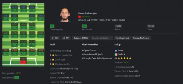 FIFA ve eFootball oyunlarında sıkça tercih edilen Çalhanoğlu, pas, şut ve duran top yetenekleriyle öne çıkar.