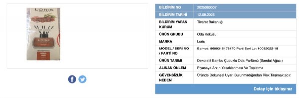 Loris markasına ait Dekoratif Bambu Çubuklu Oda Parfümü (Sandal Ağacı) için toplatılma kararı verildi.