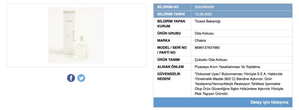 Chakra markasına ait çubuklu oda kokusu da alerjik reaksiyon riski nedeniyle yasaklandı. Ürünün satışının durdurulduğu ve piyasadaki mevcut stokların geri çekileceği bildirildi.