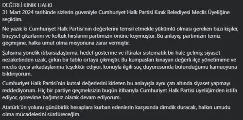 Eker, istifasına rağmen mücadelesini sürdüreceğini vurguladı: Eker açıklamasının devamında şu ifadelere yer verdi: 'Bugün itibarıyla Cumhuriyet Halk Partisi Kınık Gençlik Kolları Başkanlığı görevimden istifa ediyorum. Ancak Cumhuriyet Halk Partisi'nin genç bir neferi olarak mücadeleye devam edeceğim' ifadelerini kullandı.