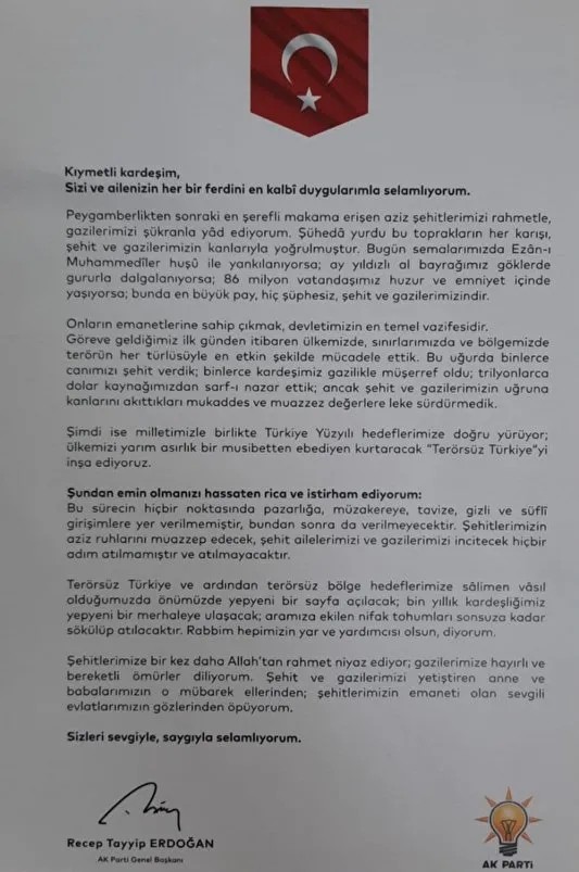 Cumhurbaşkanı Recep Tayyip Erdoğan, Terörsüz Türkiye hedefi kapsamında şehit ve gazi ailelerine yönelik bir mektup kaleme aldı. AK Parti teşkilatları, yaz boyunca bu aileleri ziyaret ederek Cumhurbaşkanı Erdoğan’ın mektubunu kendilerine ulaştıracak.