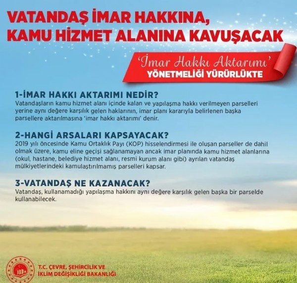 Yapılan düzenleme ile; vatandaşların verilemeyen imar haklarının değeri tespit edilecek, bu değere karşılık gelen hakları, imar planı kararıyla belirlenen alanlara aktarılacak. Uygulama, 2019 yılı öncesinde İmar Planı uygulamaları ile Kamu Ortaklık Payı (KOP) hisselendirmesi ile oluşan parseller de dahil olmak üzere, imar uygulaması marifetiyle kamu eline geçişi sağlanamayan imar planındaki kamu hizmet alanlarına (okul, hastane, belediye hizmet alanı, resmi kurum alanı gibi) ayrılan ancak uzun yıllar vatandaş mülkiyetlerindeki kamulaştırılmamış parselleri kapsayacak.