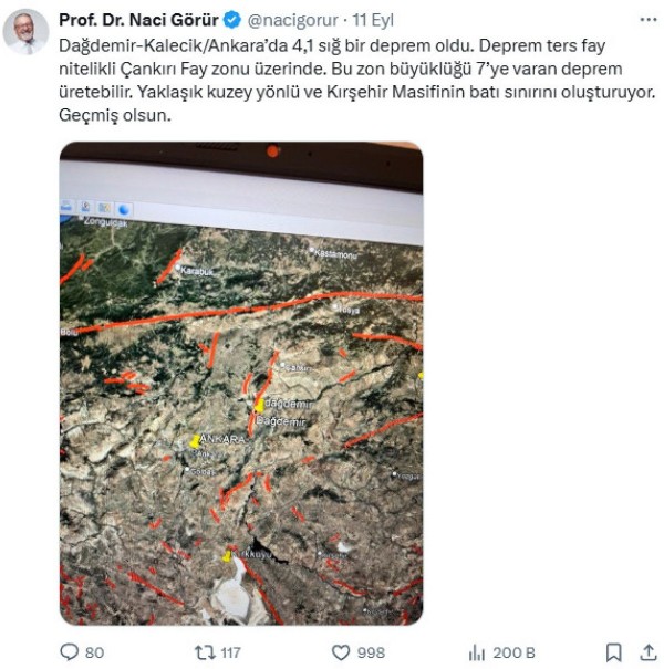 Yer bilimci Prof. Dr. Naci Görür yaşanan depremlerin ardından sosyal medya platformu X hesabı üzerinden yaptığı açıklamalar ile dikkat çekerken Ankara'da meydana gelen depremin ardından 'Bu zon büyüklüğü 7'ye varan deprem üretebilir' uyarısında bulunarak endişe yarattı.
