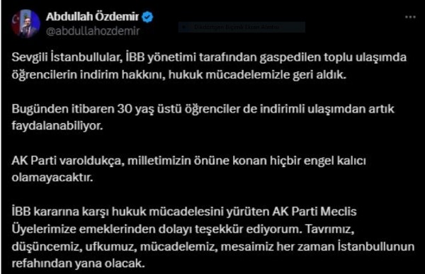 AK Parti İstanbul İl Başkanı Abdullah Özdemir, sosyal medya hesabı üzerinden İBB tarafından iptal edilen 30 yaş üstü öğrencilerin indirimli ulaşım hakkını hukuk mücadelesini kazanarak geri aldıklarını açıkladı. Yapılan açıklamada, 'Sevgili İstanbullular, İBB yönetimi tarafından gasp edilen toplu ulaşımda öğrencilerin indirim hakkını, hukuk mücadelemizle geri aldık. Bugünden itibaren 30 yaş üstü öğrenciler de indirimli ulaşımdan artık faydalanabiliyor. AK Parti var oldukça, milletimizin önüne konan hiçbir engel kalıcı olamayacaktır. İBB kararına karşı hukuk mücadelesini yürüten AK Parti Meclis Üyelerimize emeklerinden dolayı teşekkür ediyorum. Tavrımız, düşüncemiz, ufkumuz, mücadelemiz, mesaimiz her zaman İstanbullunun refahından yana olacak' ifadelerini kullandı.