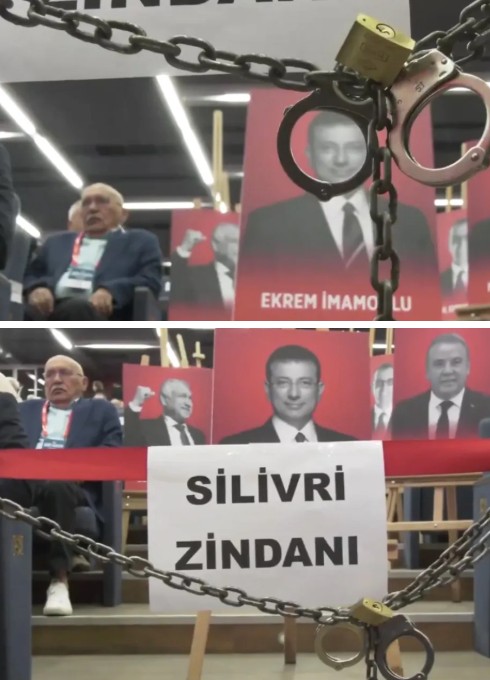 Kurultay salonunda zincirler ve kelepçeler arkasına Ekrem İmamoğlu ile tutuklu belediye başkanlarının fotoğrafları yerleştirildi.