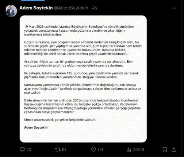 Soruşturma kapsamında itirafçı olan Adem Soytekin, sosyal medya hesabından CHP'li İmamoğlu'nun panikletecek bir açıklama yaptı. Soytekin, 200'ün üzerinde belgeyi İstanbul Cumhuriyet Başsavcılığı'na teslim ettiğini açıkladı ve şu ifadeleri kullandı: