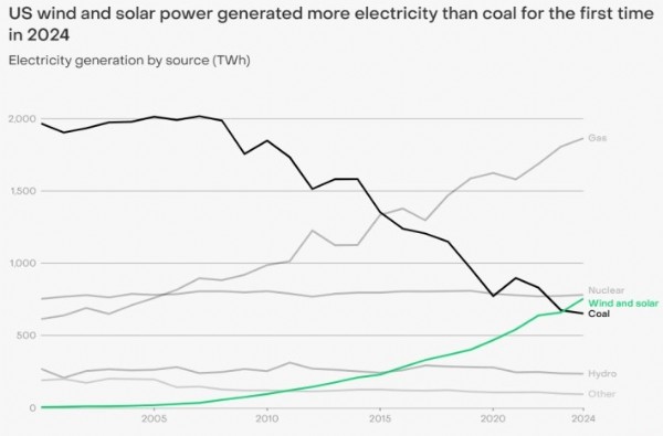 ABD’de güneş ve rüzgar enerjisi 2025’te kömür ve nükleeri geride bıraktı. Yenilenebilirlerin toplam üretim payı yüzde 26,7’ye çıkarken doğal gaz gerilerken kömür tarihi bir düşüş yaşıyor. ABD fosilden uzaklaşıyor - Kaynak: donanimhaber.com