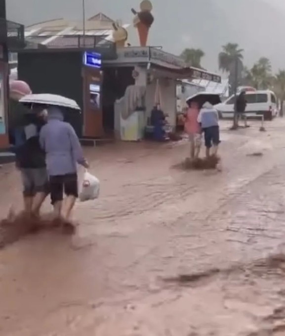 Fethiye ilçesinde etkili olan sağanak yolları göle çevirirken, turistler sel sularında eğlendi.