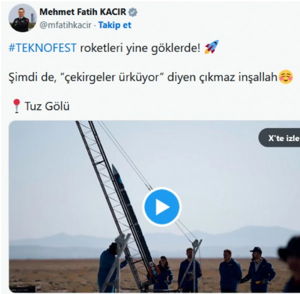 Sanayi ve Teknoloji Bakanı Mehmet Fatih Kacır, Tuz Gölü’nde TEKNOFEST roket yarışmasında fırlatma anlarını paylaşarak CHP Genel Başkanı Özgür Özel’e göndermede bulundu. Kacır, “Şimdi de, çekirgeler ürküyor diyen çıkmaz inşallah” ifadelerini kullandı.