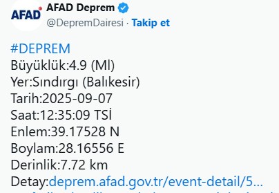 AFAD, saat 12.35'te merkez üssü Balıkesir'in Sındırgı ilçesi olan 4,9 büyüklüğünde deprem meydana geldiğini açıkladı.Balıkesir'in yanı sıra çevre illerde ve İzmir'de hissedilen depremin derinliği, 7,72 kilometre olaak belirlendi.