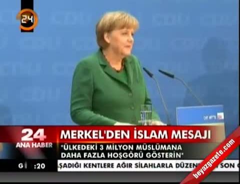 Bir üyenin İslam’ın Almanya’ya ait olup olmadığı sorusuna Merkel, “Açık olmamız gerekir ve demeliyiz ki, evet İslam bizim bir parçamız.” şeklinde cevap verdi. Merkel, Almanya’daki Müslümanların sevgisini kazanan eski Cumhurbaşkanı Christian Wulff’un “İslam Almanya’nın bir parçasıdır” sözlerini de teyit etmiş oldu.Müslümanların Almanya’da şiddet yanlısı insanlar olarak algılanmaması gerektiğini belirten Almanya Başbakanı, “Radikaller Almanya’da İslam’ı temsil etmiyor.” diye konuştu.