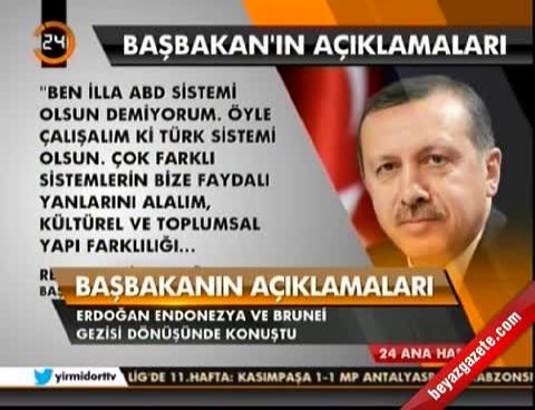 Anayasa Komisyonu 'na verilen AK Parti teklifinde ABD'deki başkanlık sisteminin öngörüldüğünün hatırlatılması üzerine Erdoğan, 'Ben illa ABD sistemi olsun demiyorum. Öyle çalışalım ki, Türk sistemi olsun. Çok farklı sistemlerin bize faydalı yanlarını alalım. En ideali için karar verelim ' dedi.
