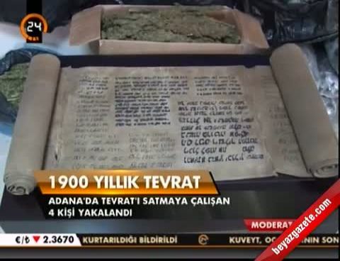 Emniyet Müdürlüğü Kaçakçılık ve Organize Suçlarla Mücadele Şubesi Mali Büro ekipleri, istihbarat çalışmaları sonucu alıcı kılığına girerek, tarihi eser pazarladıkları ileri sürülen Ş.C., Y.Ş. ile coğrafya öğretmeni T.N. ve S.C.D. ile anlaştı. Polis, 44 santimetre eni, 878 santimetre uzunluğunda, deri üzerinde İbranice yazılar bulunan eser için yüksek miktarda fiyata pazarlığa girişti. Merkez Yüreğir ilçesinde bir otelin önündeki pazarlık polisin kimliğini açıklamasıyla sona erdi. Gözaltına alınan tarihi eser kaçakçısı 4 kişi, 'eseri eskiciden aldıklarını' öne sürerken, bu kişilerin eserin tarihini tespit için karbon testi de uygulattıkları öğrenildi. Kutsal kitap Tevrat'tan ‘bab’lar bulunan eserin 1900 yıllık olduğu tahmin ediliyor. Emniyet müdürlüğünde ifadesi alınan 4 kişi, 'tarihi eser kaçakçılığı' suçlamasıyla adli mercilere sevk edildi.