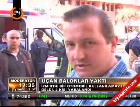 Araçtan kendi imkanlarıyla çıkan sürücü Hakkı Akyürek (34) yüzünden yaralandı, yangına müdahale etmek isteyen Turan Ergün de hafif yanıkla kurtuldu. Hakkı Akyürek yönetimindeki özel bir şirkete ait 35 AS 6809 plakalı araç İzmir'in konak ilçesi Basmane semtinde seyir halindeyken içerisinde bulunan kimyasal gazla şişirilmiş balonların patlaması sonucu yangın çıktı.