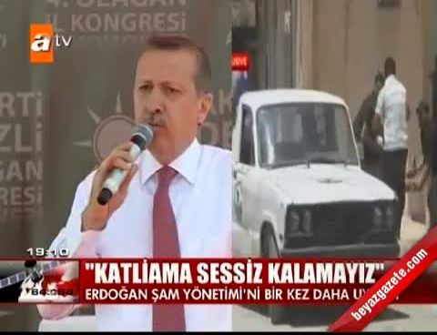 Kendilerinin bir dönem Esed ile ailece görüştüklerini belirten Erdoğan, şunları kaydetti: “Suriye’de çok büyük acılar, dramlar yaşanıyor. Suriye halkı, Suriye’deki kardeşlerimiz bebek, çocuk, kadın yaşlı denmeden, devlet destekli kanlı çeteler tarafından toplarla tanklarla vurularak, hattâ boğazlanarak katlediliyor. 1982’de bu eli kanlı diktatörün babası da aynı şeyi yapmıştı, Hama’da 30 bin kardeşimizi katletmişti. Evladı da o yolda, rakam 15 binin üzerinde. 108 kişiyi katlettiler, 50’si çocuktu. Dün Hama’da aynı şeyi yaptılar. Zulüm ile âbad olunmaz. Türkiye’de, bu zalimin yanında yer alanlar var. Zalimlerin yanında yer alanlar da zalim olur. Ailece görüşüyorduk ama çizgiden kopulduğu anda biz babamız olsa bırakırız. Biz, hakkı ayağa kaldırmaya memuruz. Bugün yine Hama ile birlikte Suriye’deki diğer kentlerde yapılan katliamları seyredenler, akan kanın kendi el, yüz ve vicdanlarına sıçrayacağını bilmelidir. Biz Türkiye olarak bunun takipçisiyiz. Hiç kimse kenara çekilip elini kolunu bağlayıp oturamaz. Gözü dönmüş katliamlar karşısında kimse sessiz kalamaz. Birleşmiş Milletler Genel Sekreteri, bizim daha önce söylediğimizi tekrarladı, 'Bu barbarlıktır.' dedi.