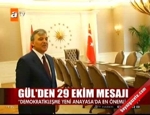 Cumhurbaşkanı Gül, cumhuriyetin kuruluşunun 89. yıl dönümü sebebiyle bir mesaj yayımladı. "Bugün milletimizin en büyük bayramını coşkuyla kutlarken, cumhuriyetimizi nitelikleri ve kazanımlarıyla her geçen gün daha da ileri taşımanın kıvancını duyuyoruz." diyen Gül, Atatürk'ün önderliğinde yürütülen istiklal mücadelesinin emsalsiz bir zaferle neticelenmesi ve ardından milletin kendi iradesi doğrultusunda yönetimde söz sahibi olmasını sağlayan Cumhuriyet'in kurulmasının Türkiye'nin istikametini belirleyen bir adım olduğunu ifade etti.