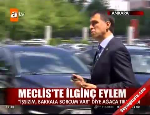 Karabük'ten gelen bir vatandaş ödeyemediği bakkal borcu nedeniyle TBMM bahçesinde ağaca çıkarak eylem yaptı.Meclis'e gelerek AK Parti İstanbul Milletvekili Hakan Şükür ile görüşmek istediğini belirten ancak görüşemeyen Murat Halvacı isimli vatandaş, Meclis bahçesindeki bir ağaca çıkarak bağırmaya başladı.